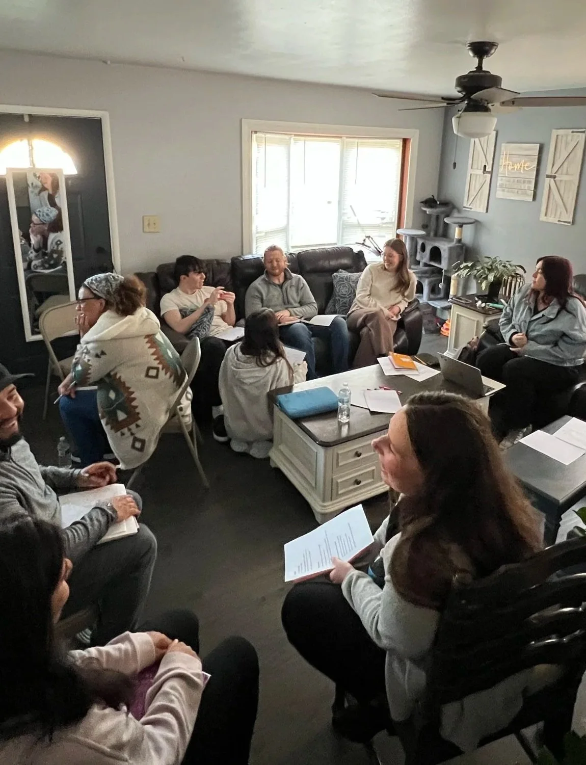 We gather around tables to share our stories and worship together.